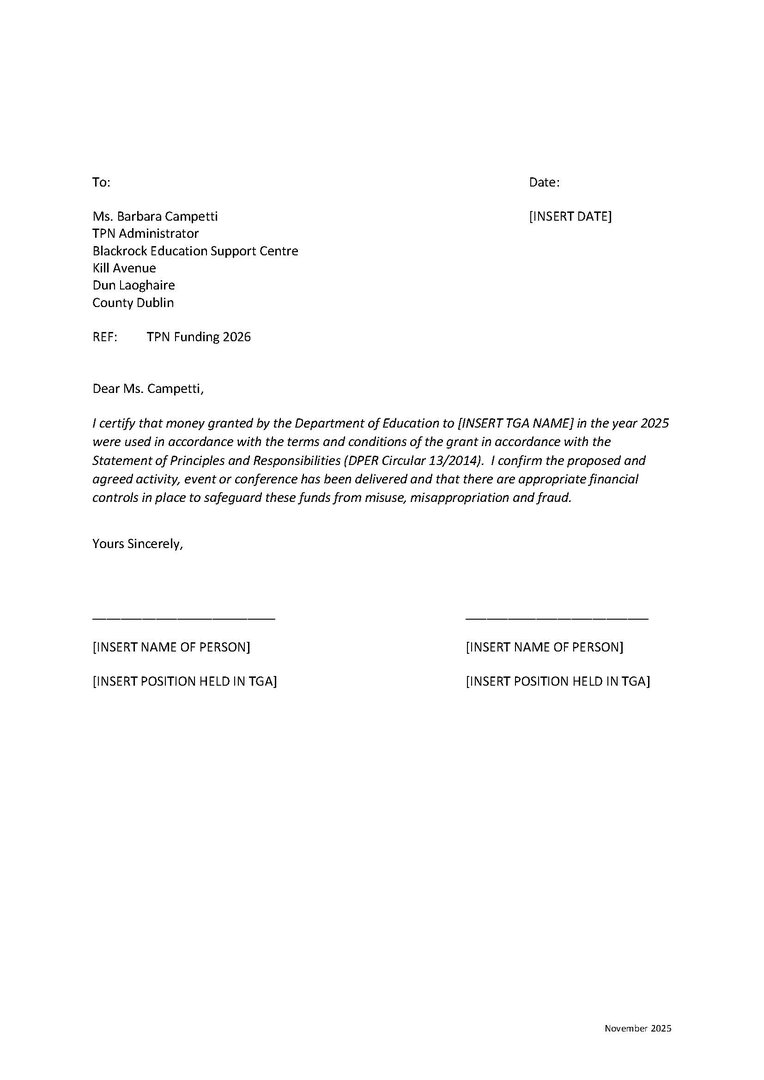 TGAs are required to certify annually to Blackrock Education Support Centre that funding granted was used in accordance with the purpose for which it was intended and in compliance with DPER circular 13/2014. TGAs are required to submit a Certificate of Assurance and be in a position to provide details for income received from the TPN Scheme and a list of expenditure which this TPN Scheme income was used for. You will be required to submit it with your November proposals.