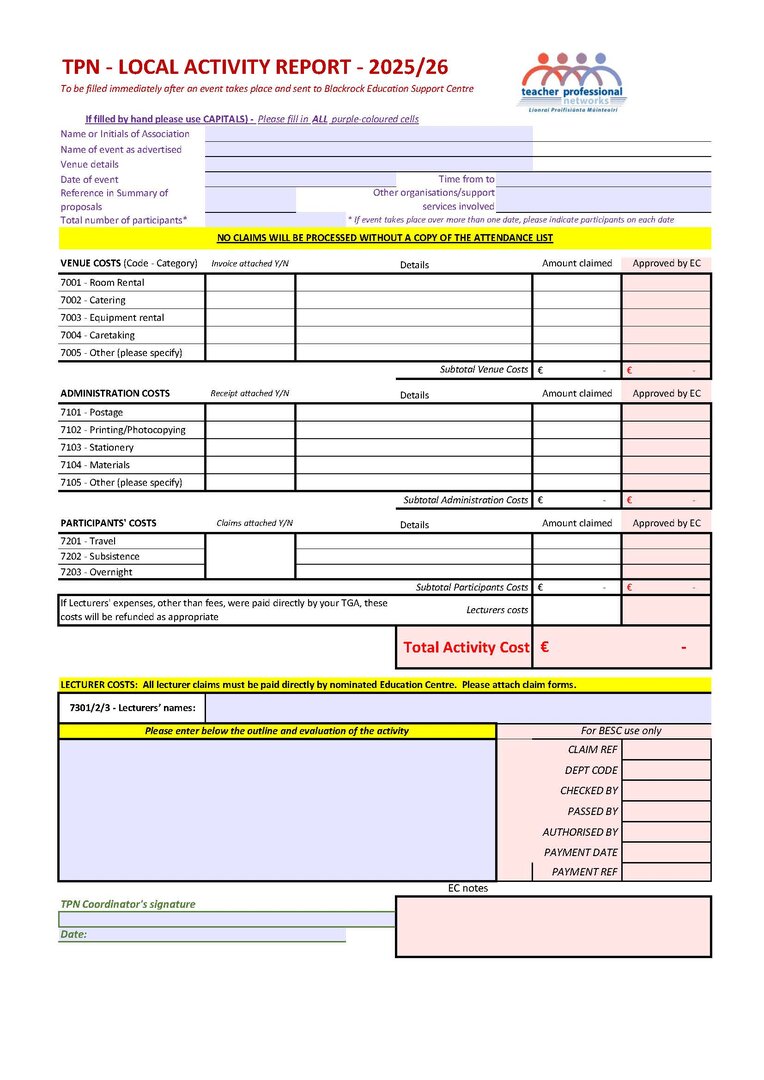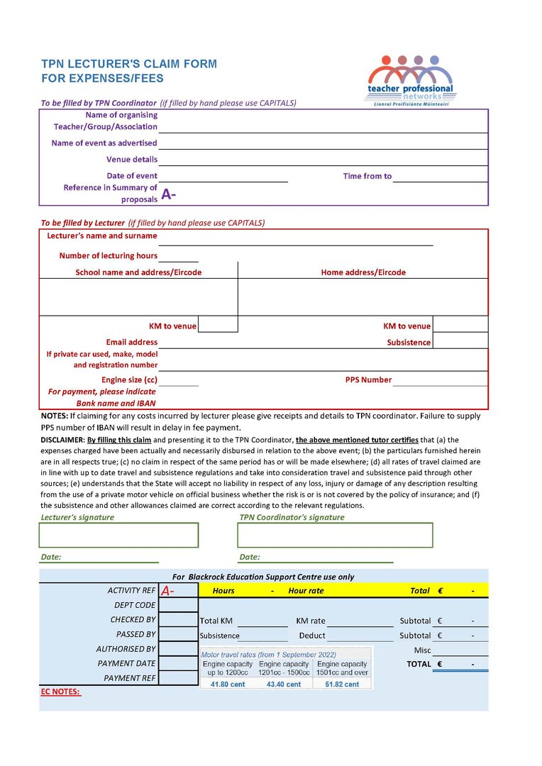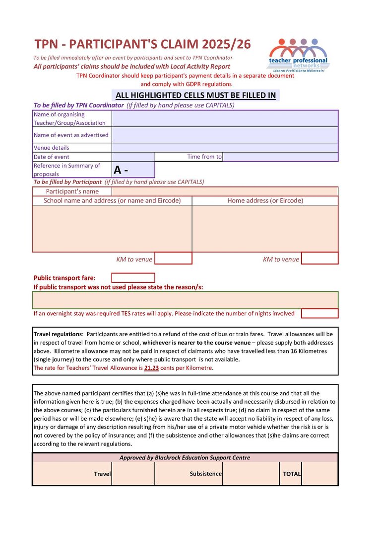 E9) All claims, either from lecturers or participants, must include both school and home address; TPN funds can only be used to pay participants’ claims of post-primary teachers.