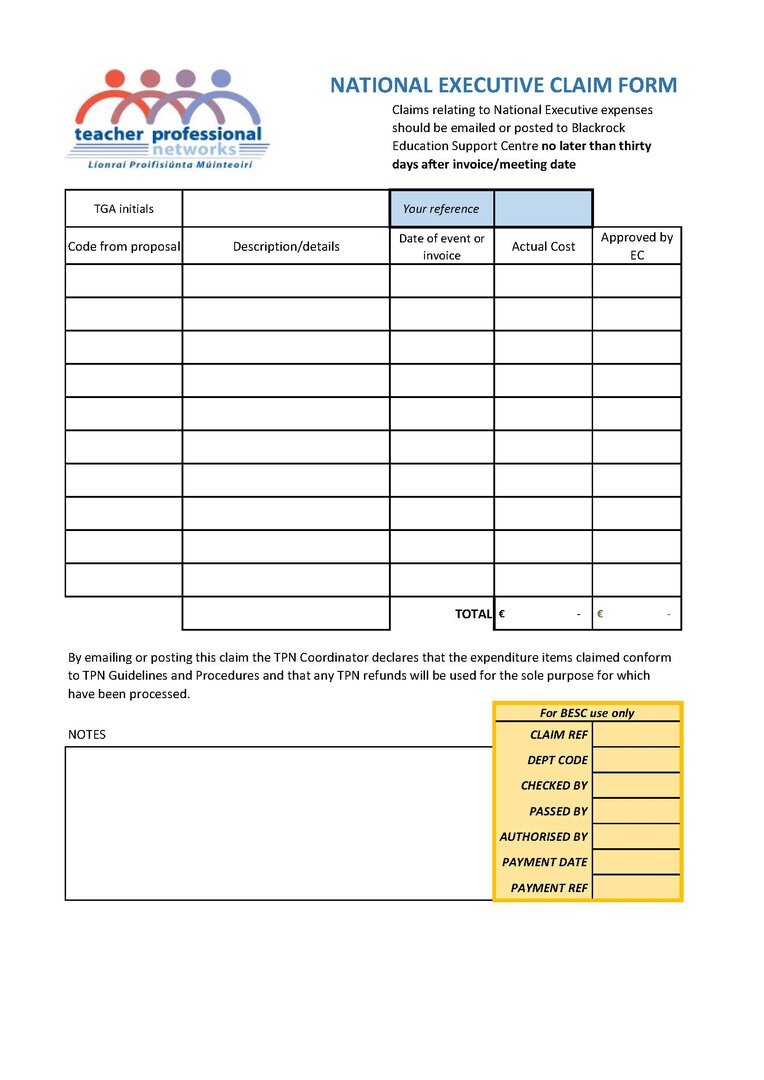 Claims to be presented by the TPN Coordinator to BEC ESC for payment.F1) DEADLINE: a maximum of thirty days after the date of expense or meeting; copy of attendance roll, invoices, receipts and claim form(s) must be included.
